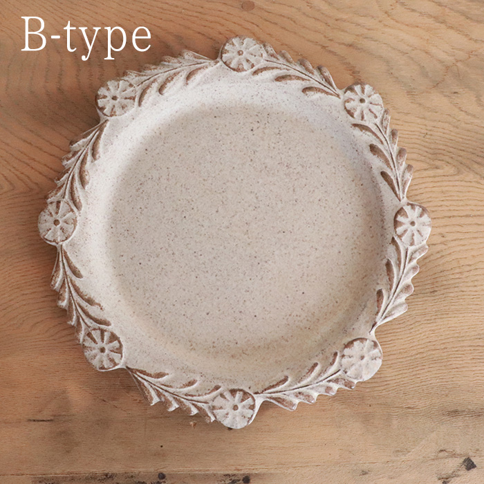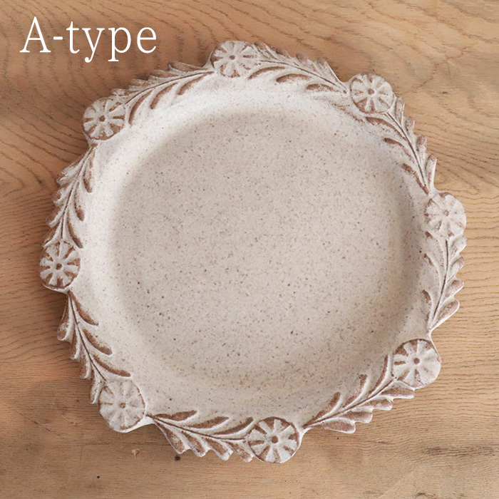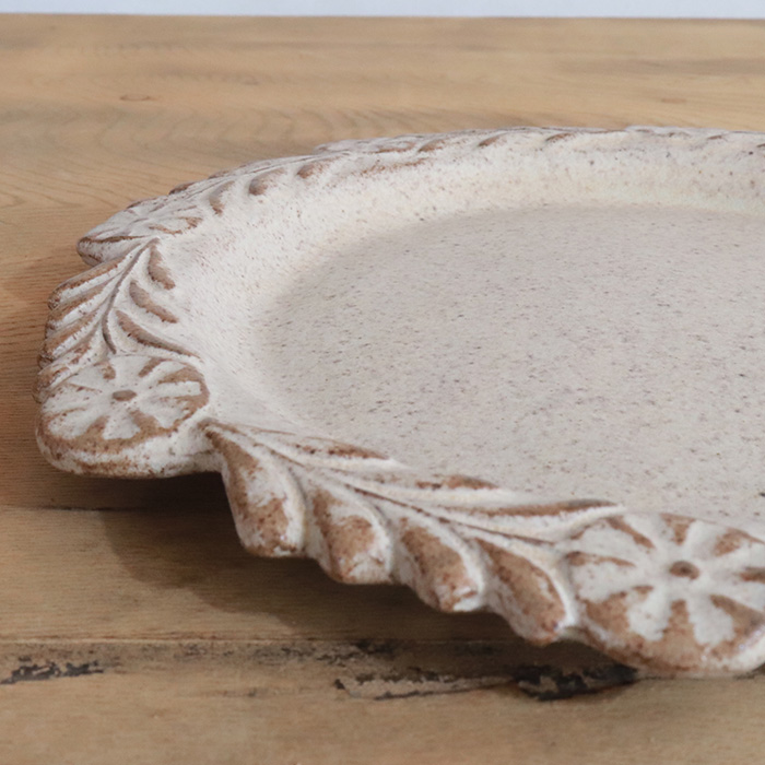リースのような花輪模様を縁にあしらった丸皿です。