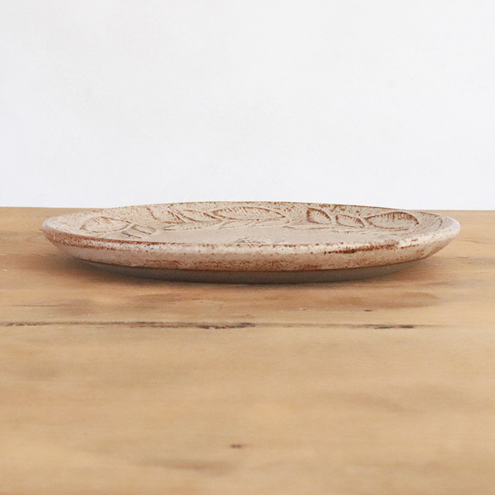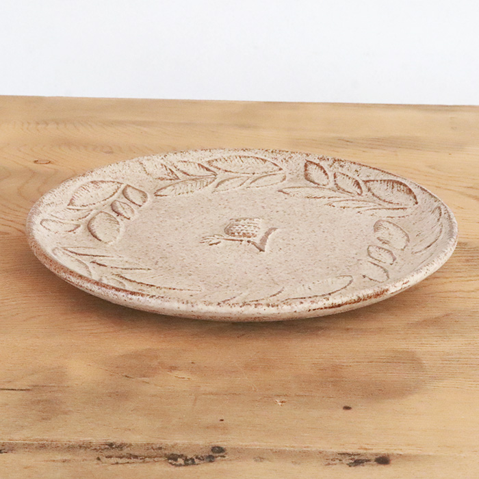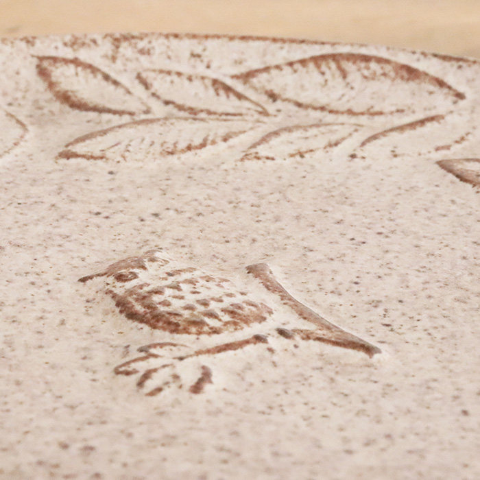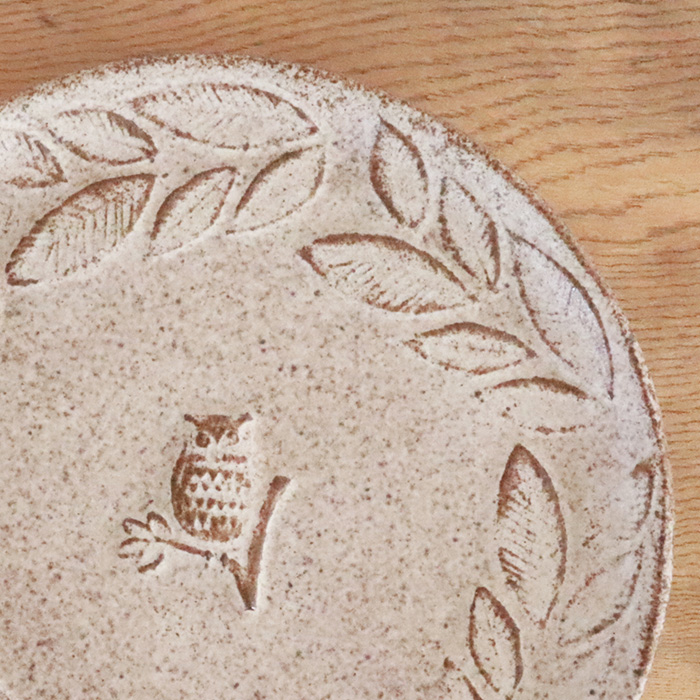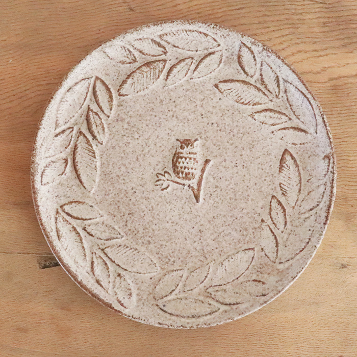 一羽のフクロウが佇むお皿、葉っぱに囲まれた世界観は何か物語がはじまりそうな雰囲気。