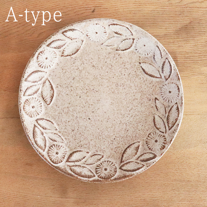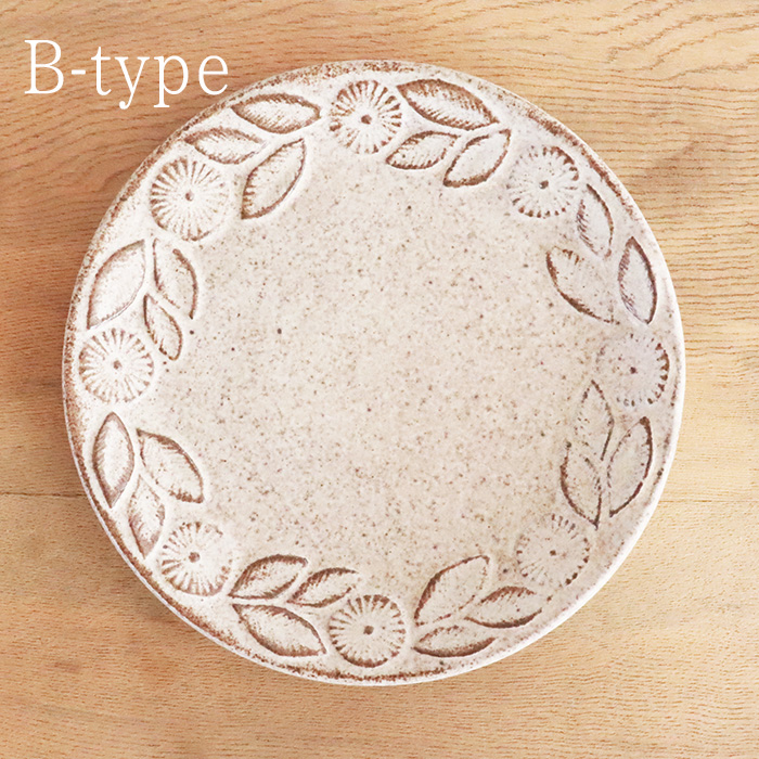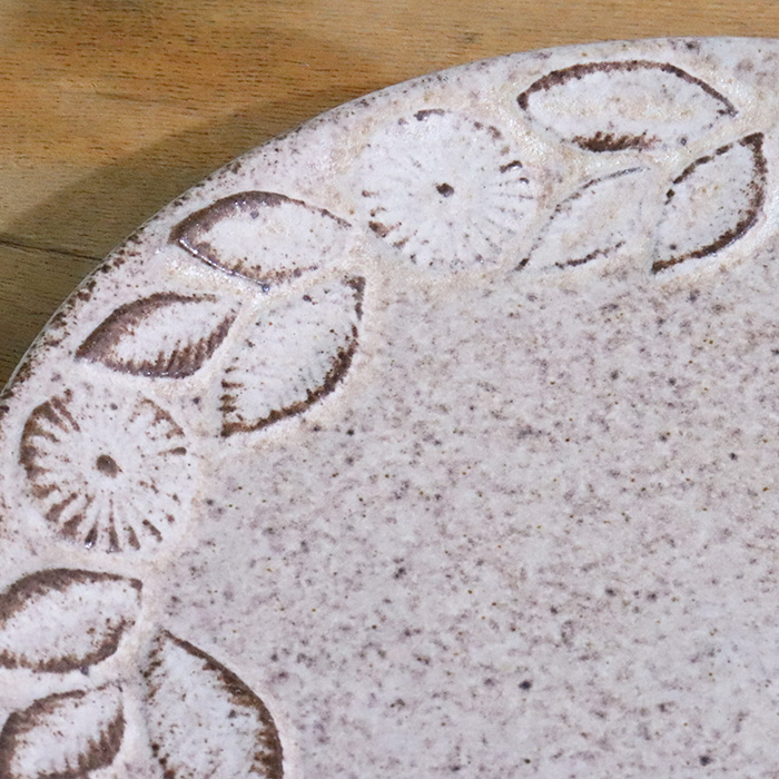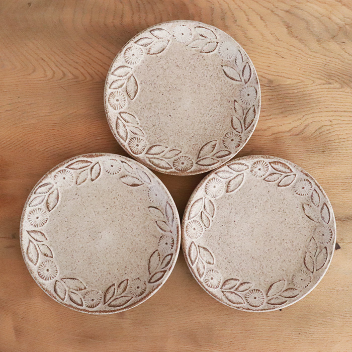 ケーキ皿や取り皿として活躍しそうなサイズに、リースのような花模様が装飾されたプレートは盛り付けた料理をさらに華やかに見せてくれます。