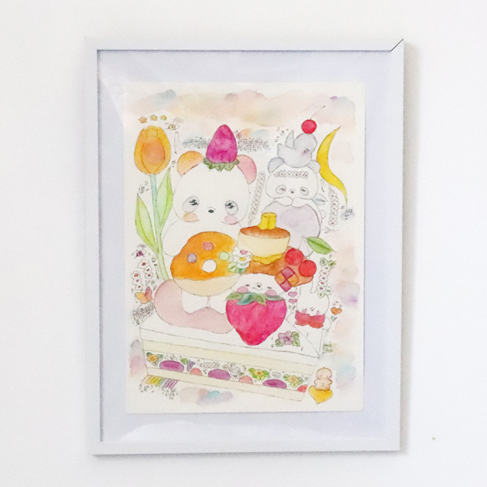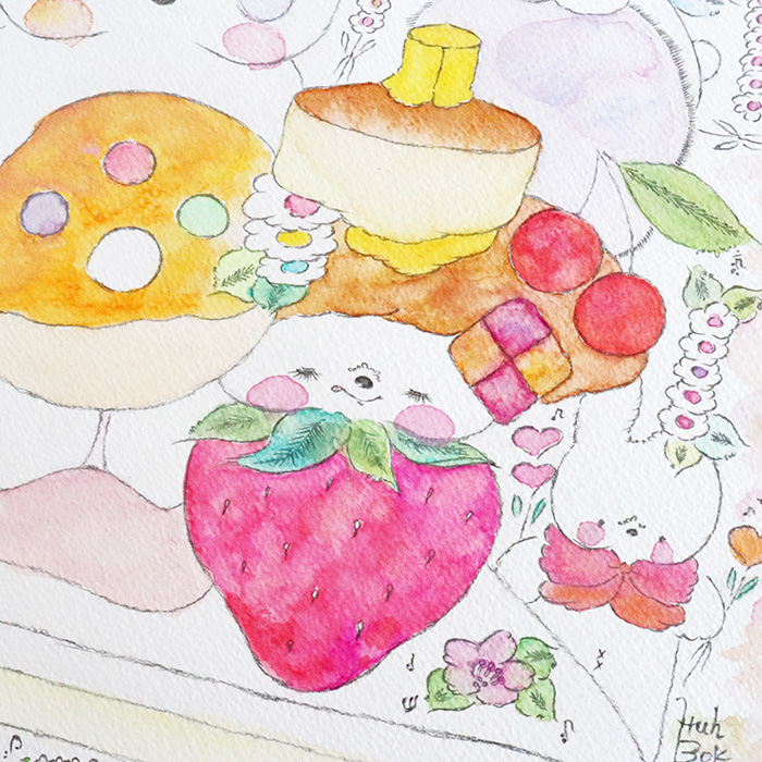甘いおやつやかわいい動物たちが並ぶ夢みたいな世界を、淡いパステルカラーで表現しました。