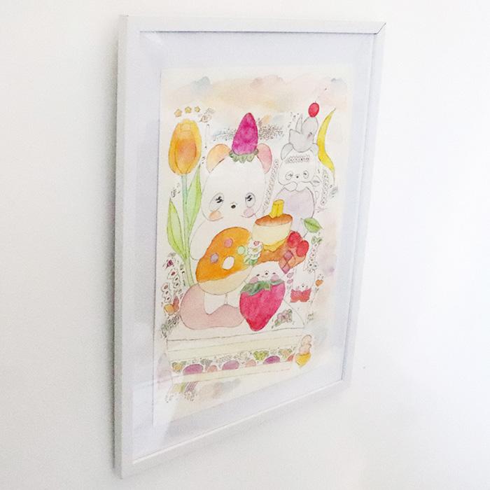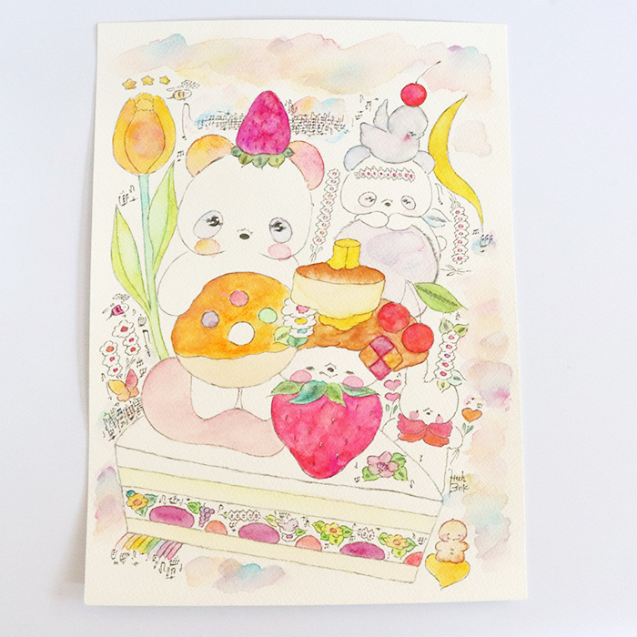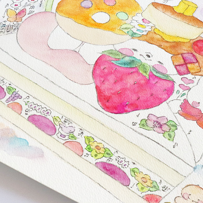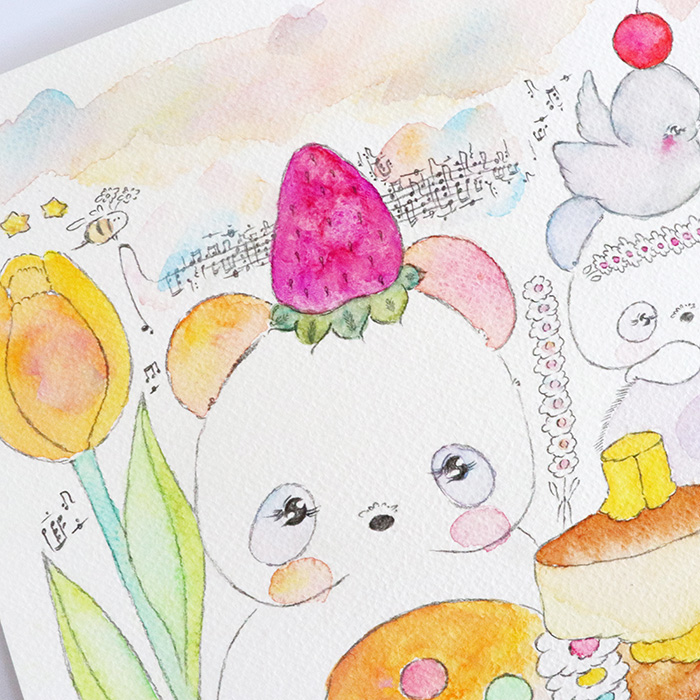 用紙は厚みのあるコットン紙、表面にはほんのりとポコポコした凹凸(テクスチャー)があり、作品の可愛さをさらに引き立てています。