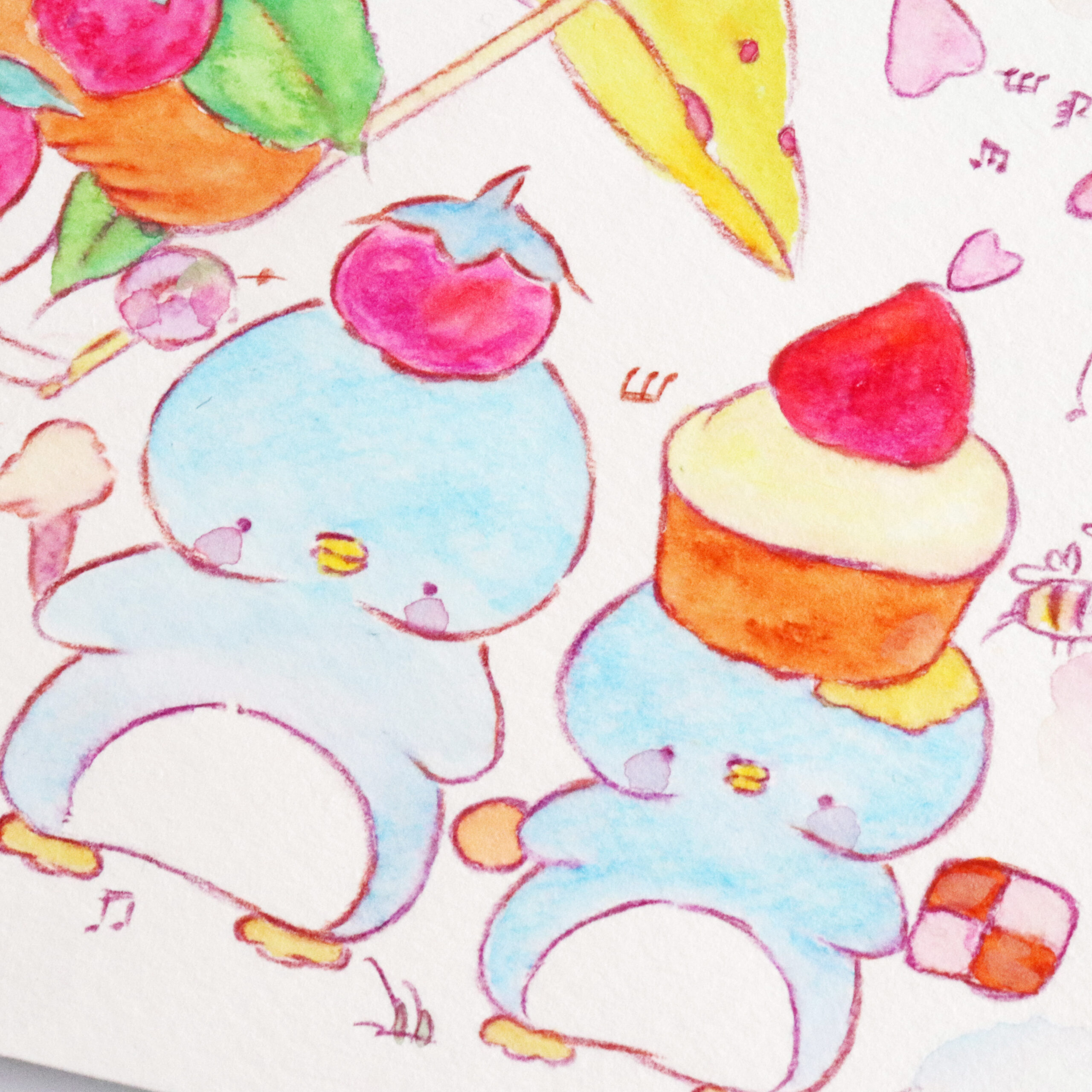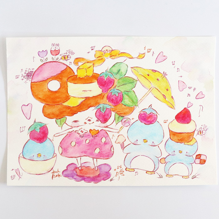 水彩の淡いパステルカラーで描かれた動物たちやスイーツが、見ているだけで心がほっとする世界観をつくっています。