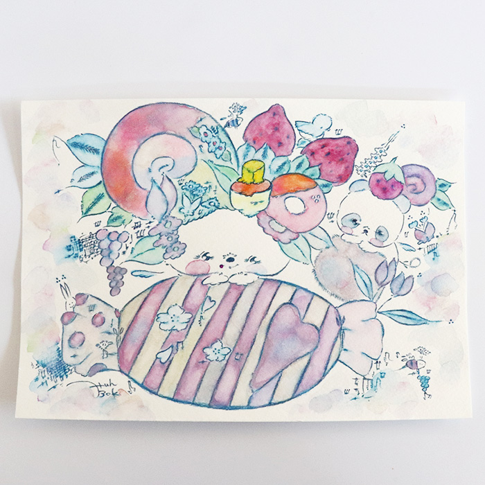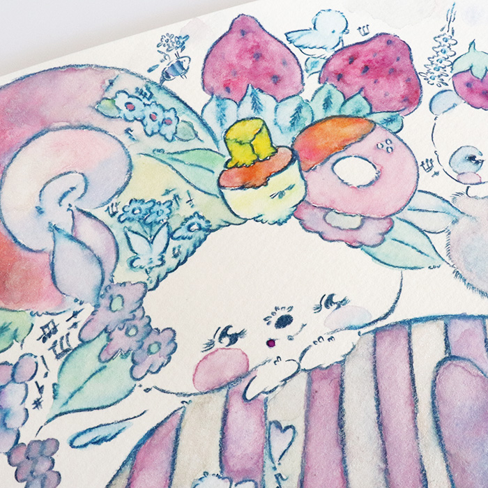 水彩の淡いパステルカラーで描かれた動物たちやスイーツが、見ているだけで心がほっとする世界観をつくっています。