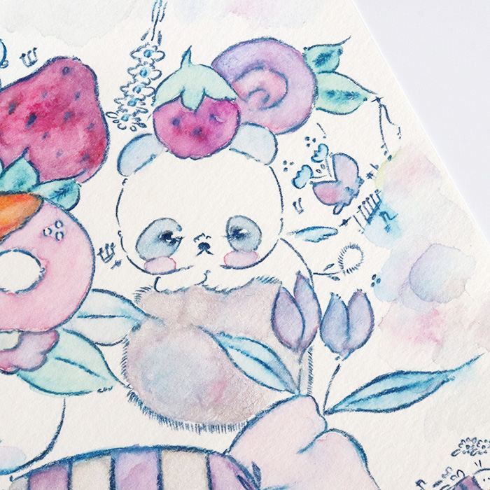 用紙は厚みのあるコットン紙、表面にはほんのりとポコポコした凹凸(テクスチャー)があり、作品の可愛さをさらに引き立てています。
