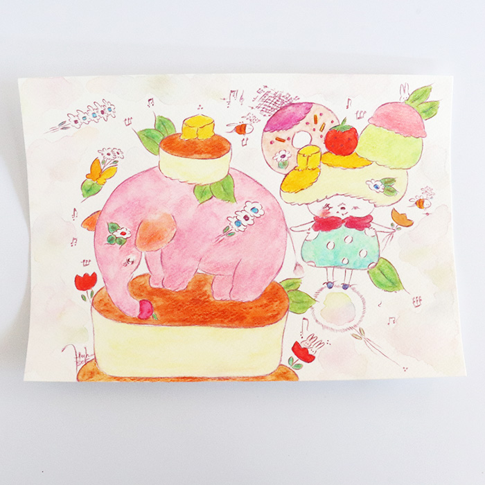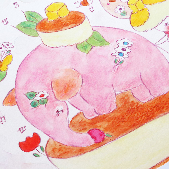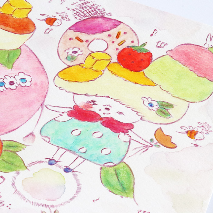 水彩の淡いパステルカラーで描かれた動物たちやスイーツが、見ているだけで心がほっとする世界観をつくっています。