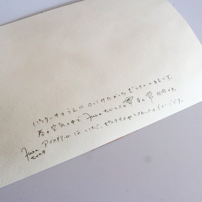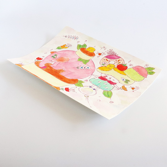 用紙は厚みのあるコットン紙、表面にはほんのりとポコポコした凹凸(テクスチャー)があり、作品の可愛さをさらに引き立てています。