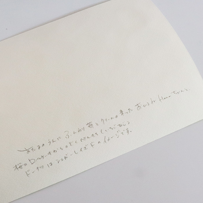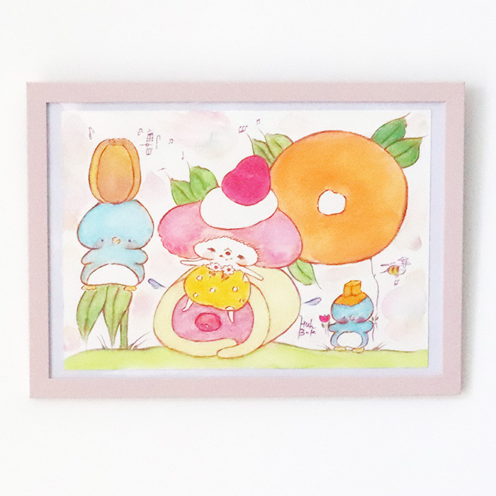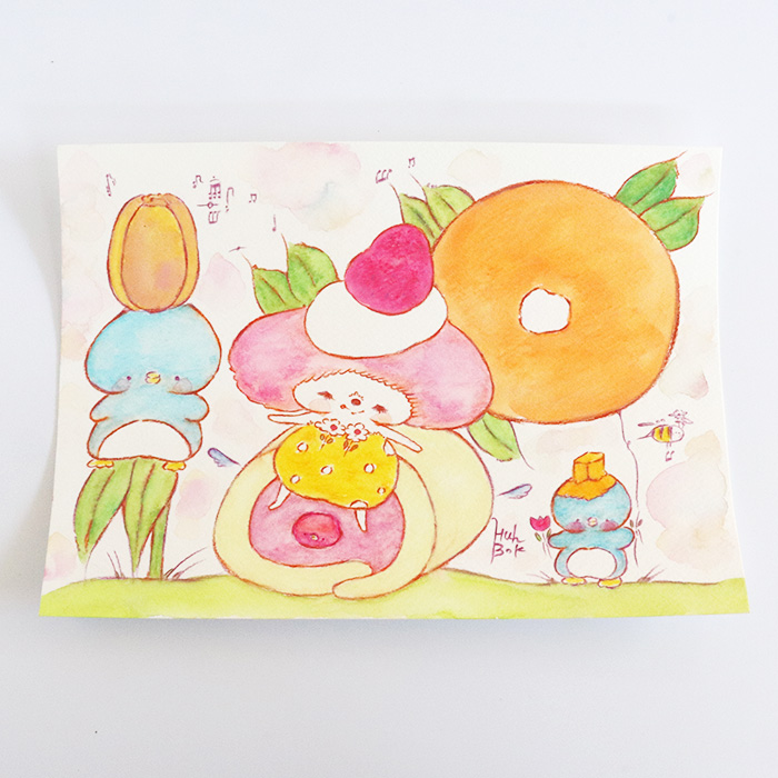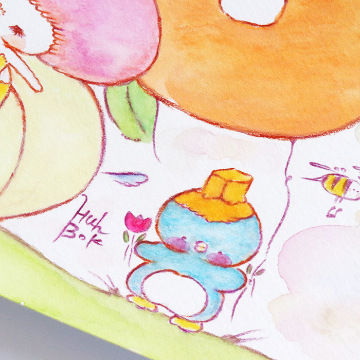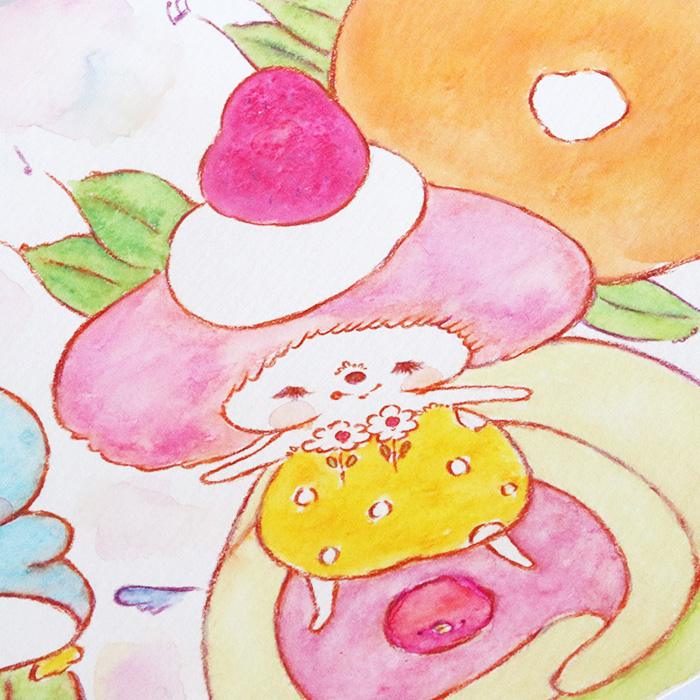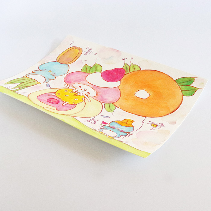 用紙は厚みのあるコットン紙、表面にはほんのりとポコポコした凹凸(テクスチャー)があり、作品の可愛さをさらに引き立てています。