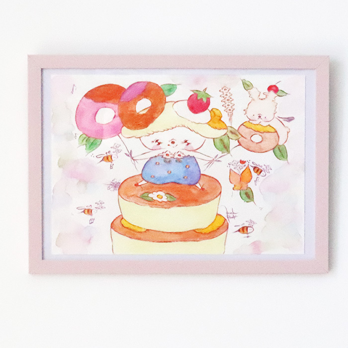 水彩の淡いパステルカラーで描かれた動物たちやスイーツが、見ているだけで心がほっとする世界観をつくっています。
