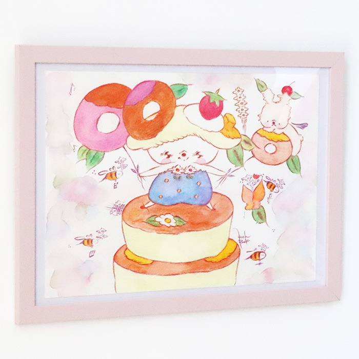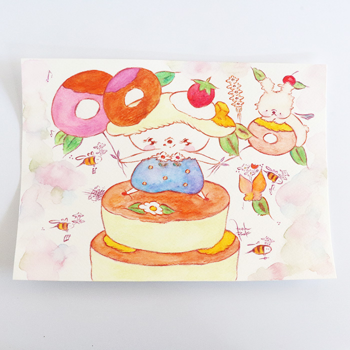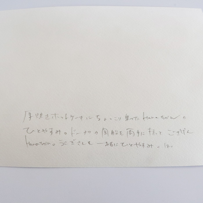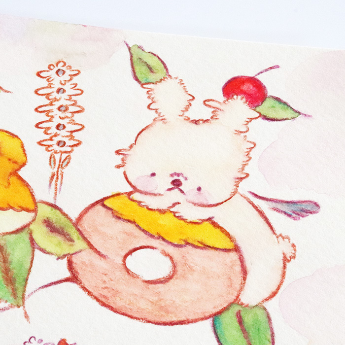 用紙は厚みのあるコットン紙、表面にはほんのりとポコポコした凹凸(テクスチャー)があり、作品の可愛さをさらに引き立てています。