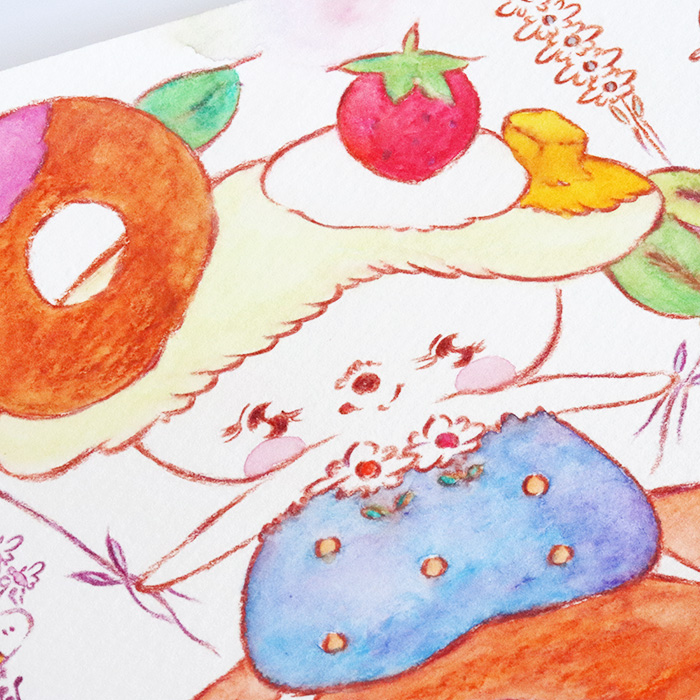 色鉛筆の柔らかなラインに、ふんわりとした水彩の色合いを重ねて描いたイラストです。