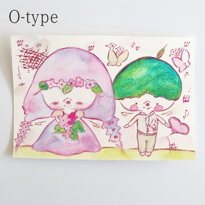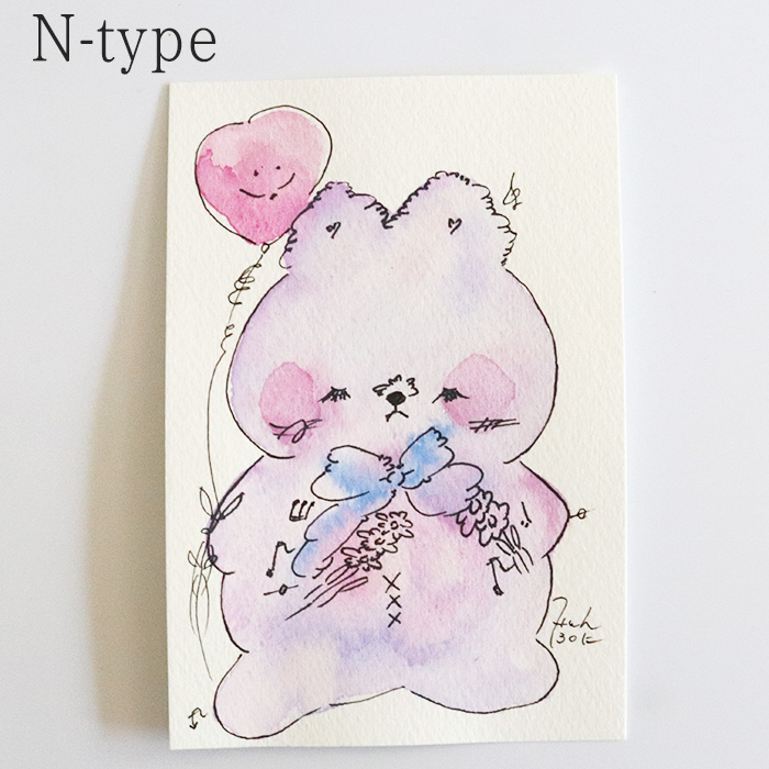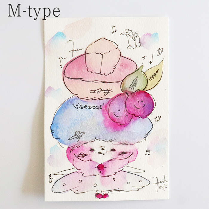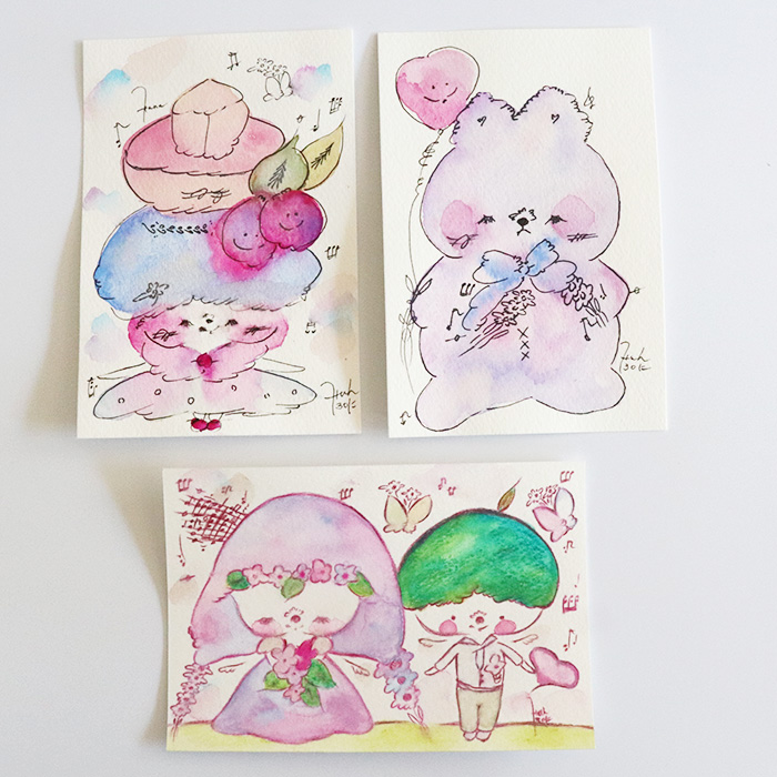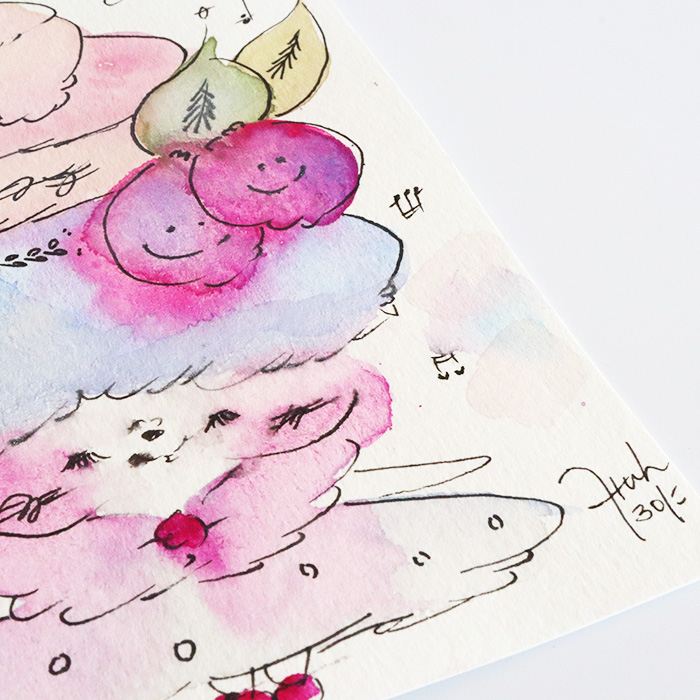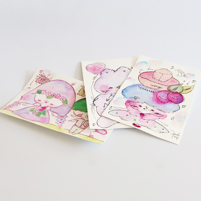 用紙は厚みのあるコットン紙、表面にはほんのりとポコポコした凹凸(テクスチャー)があり、作品の可愛さをさらに引き立てています。