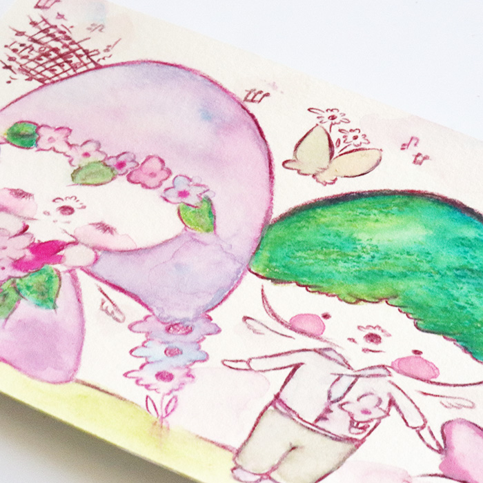 やわらかな水彩の色合いに、インクペンの繊細なラインを重ねて描いたハガキサイズの原画です。