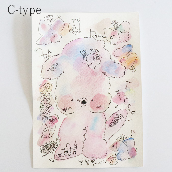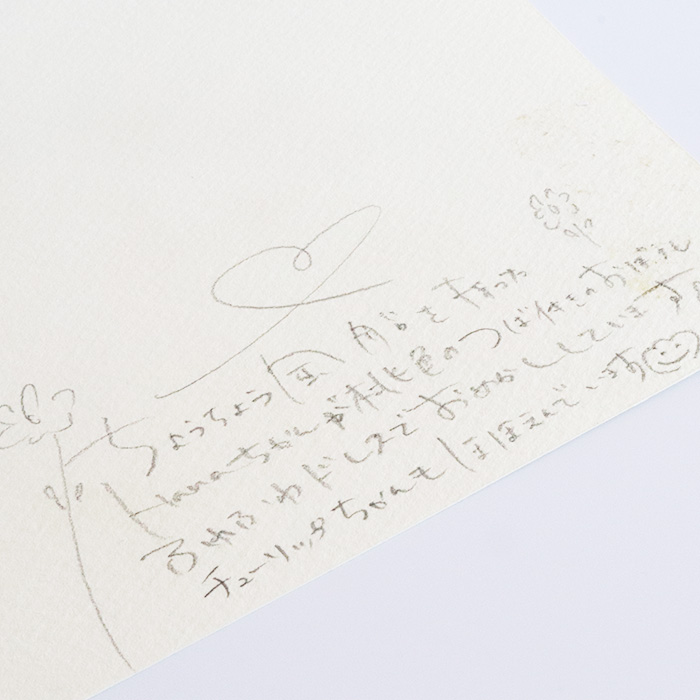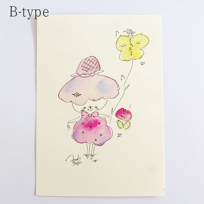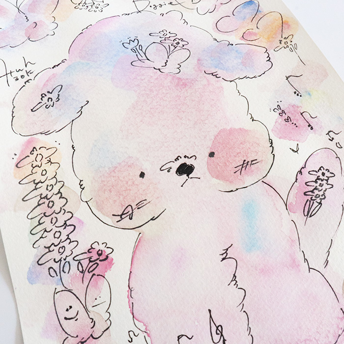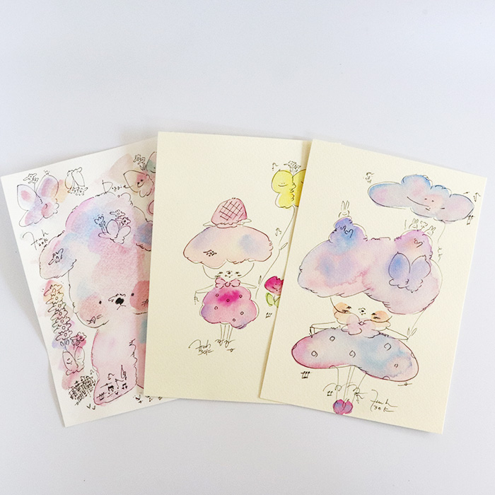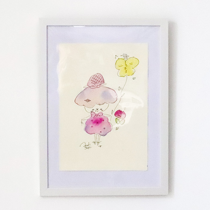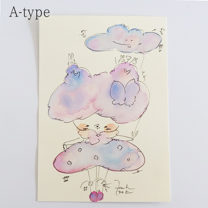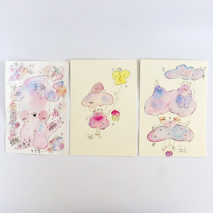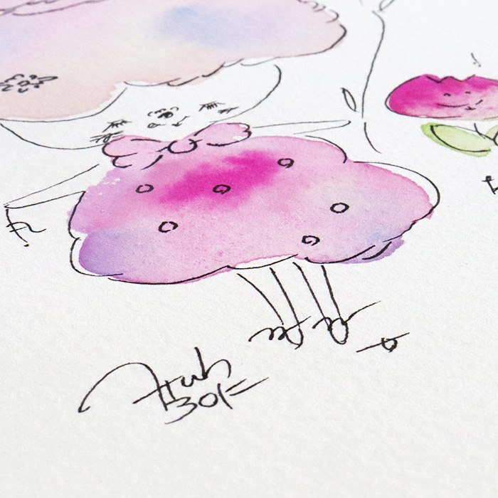 用紙は厚みのあるコットン紙、表面にはほんのりとポコポコした凹凸(テクスチャー)があり、作品の可愛さをさらに引き立てています。