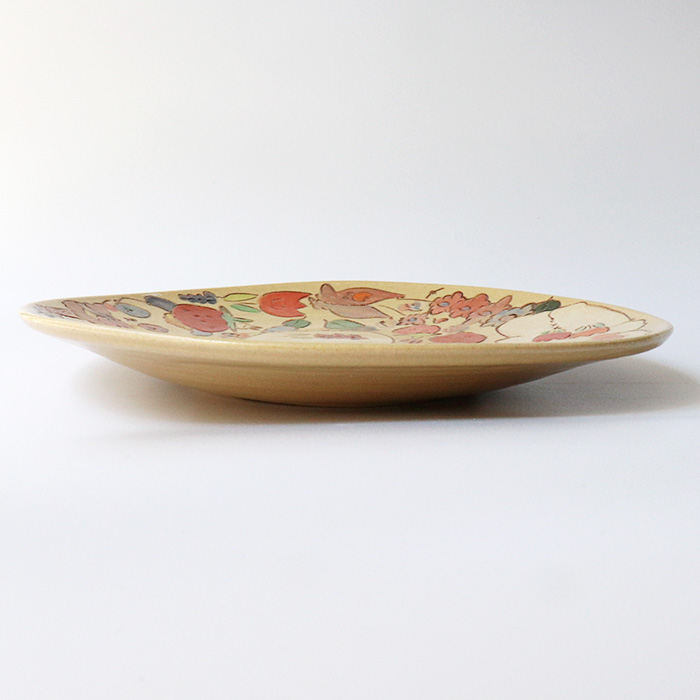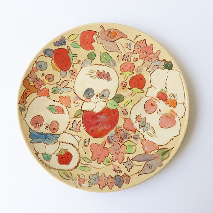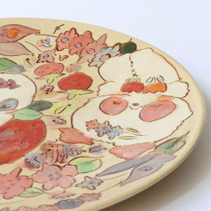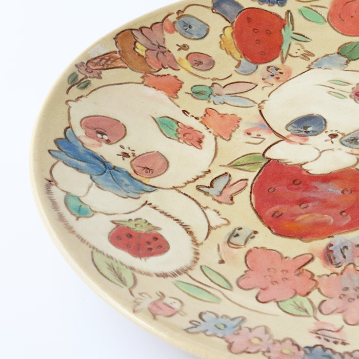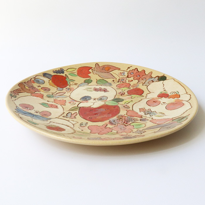 お花とフルーツに囲まれて遊ぶ、モフモフパンダがかわいい、素朴であたたかい雰囲気のお皿です。