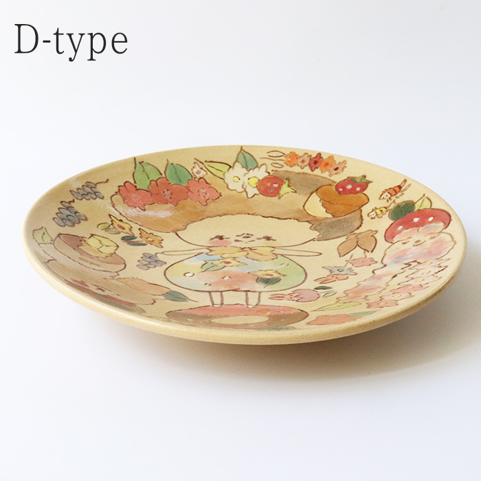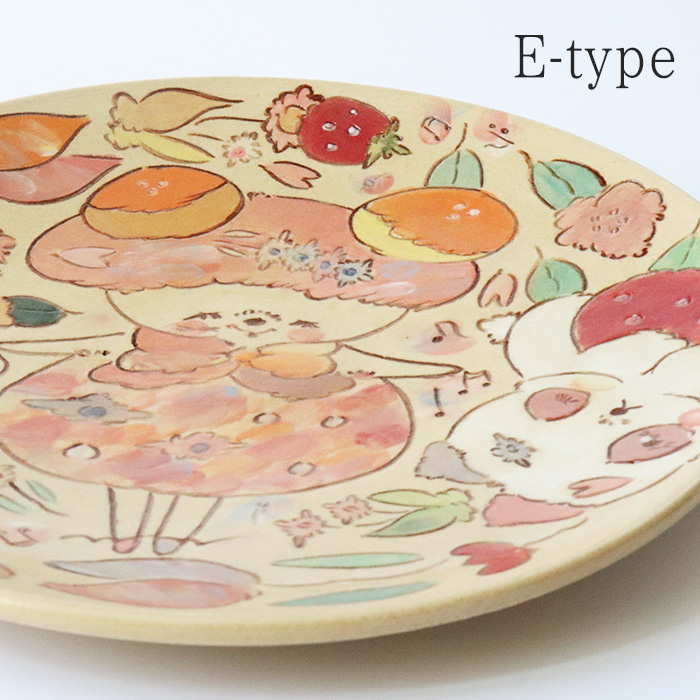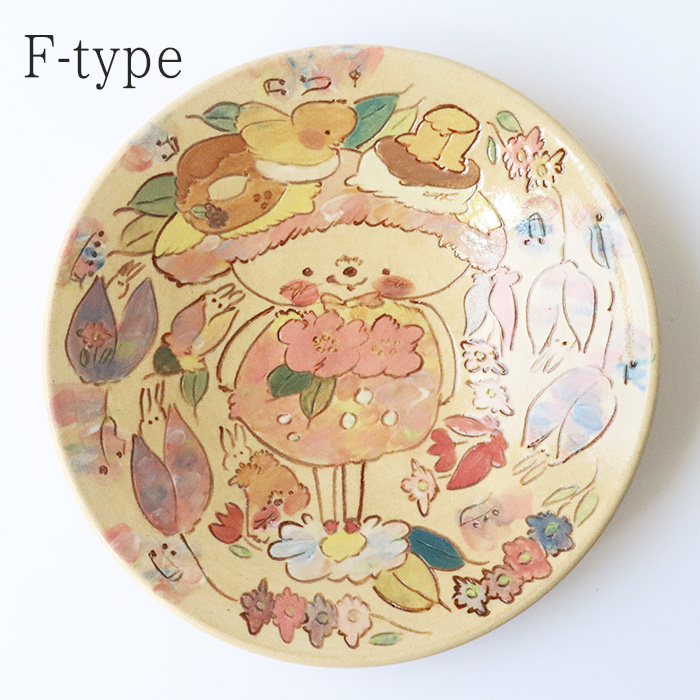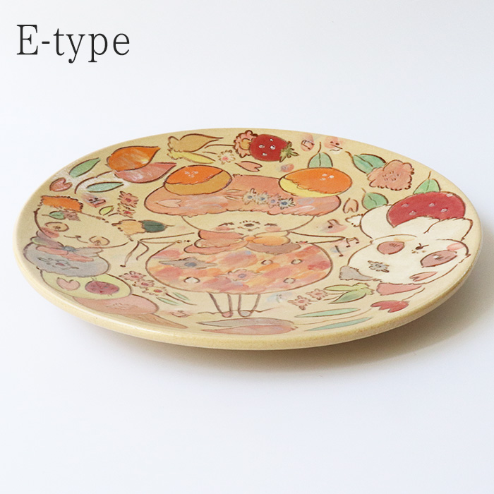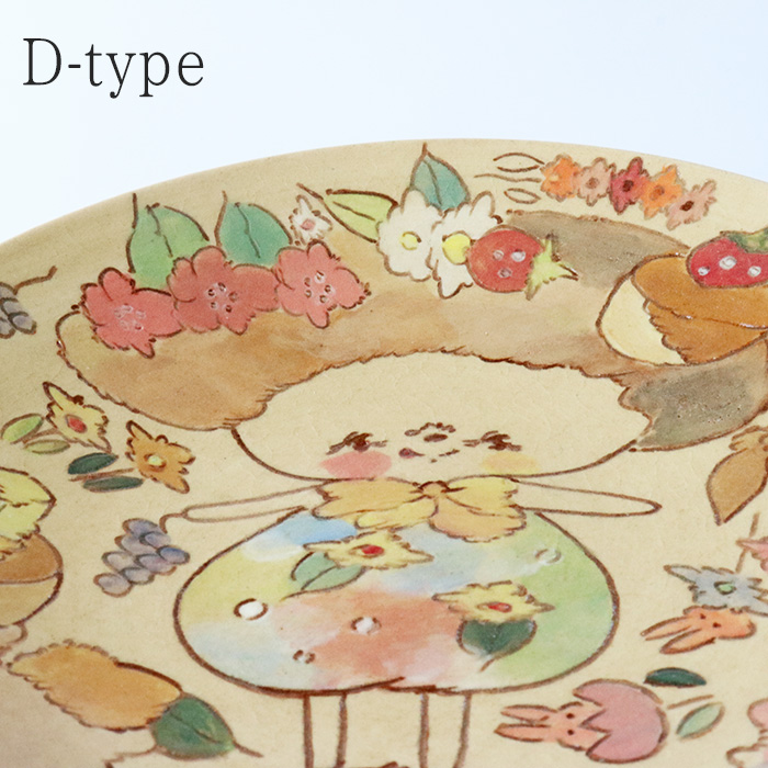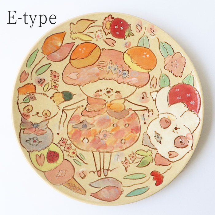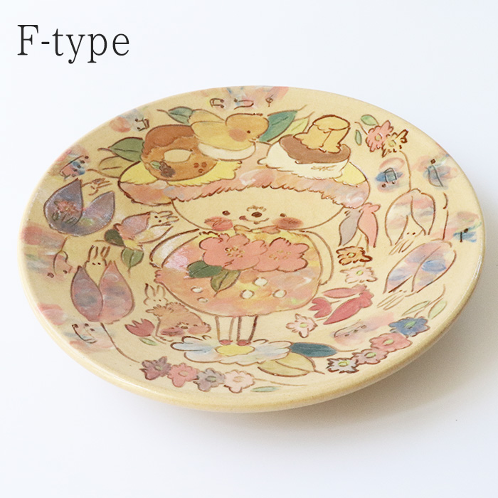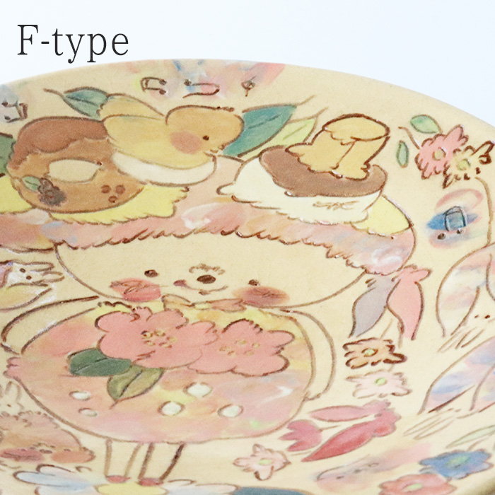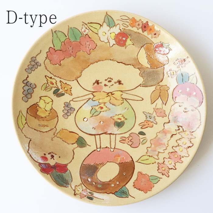 花やスイーツに囲まれた小さな仲間たちが、のんびりと過ごす時間を描いた手描きプレートです。
