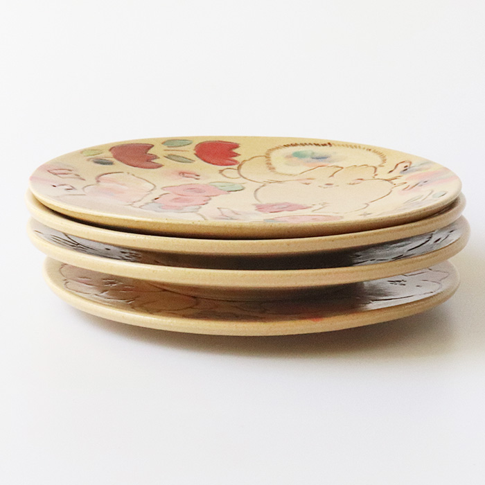ハナちゃんやモフモフ動物たち、スイーツやかわいい花などプレートごとに表情がことなりますが、同じ世界観で描いているため、並べても自然に馴染み、食卓にやさしい統一感が生まれます。