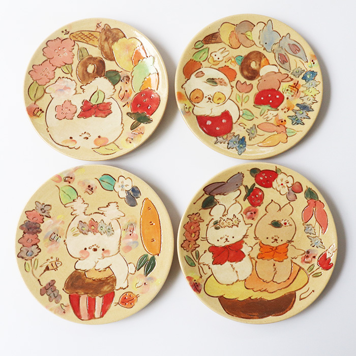 ハナちゃんやモフモフ動物たち、スイーツやかわいい花などプレートごとに表情がことなりますが、同じ世界観で描いているため、並べても自然に馴染み、食卓にやさしい統一感が生まれます。
